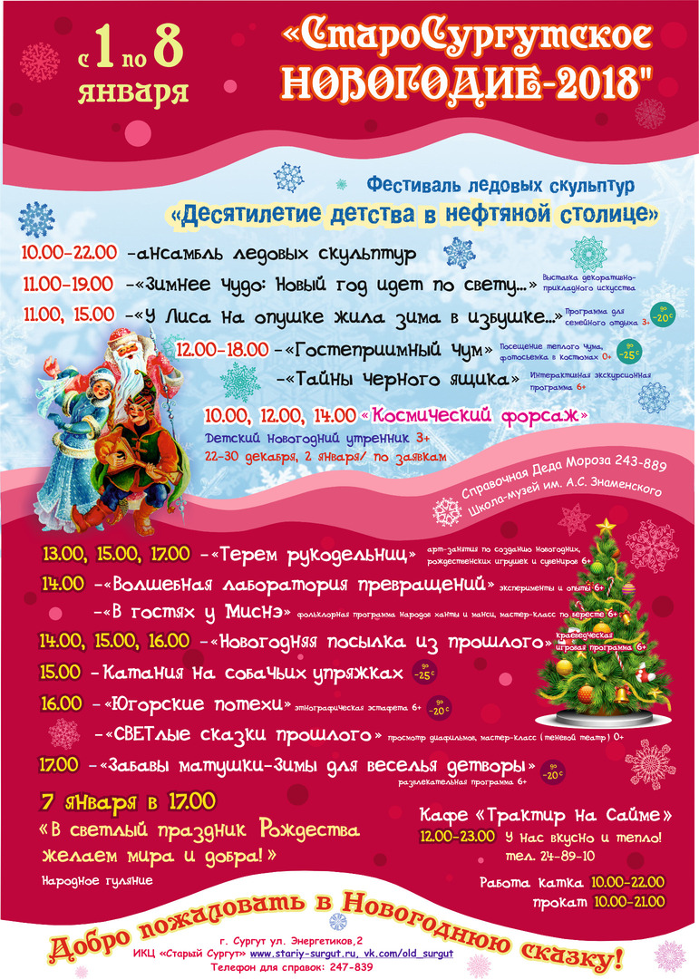 Комитет культуры и туризма Администрации города разработал программу праздничных мероприятий для сургутян на Новый год и зимние каникулы. Афиша разнообразна и рассчитана на жителей разных возрастов, вкусов, интересов. Горожан ждут уличные гуляния, театрализованные игровые программы, выставки, экскурсии, викторины, спортивные мероприятия, новогодние и рождественские утренники и многое другое.
