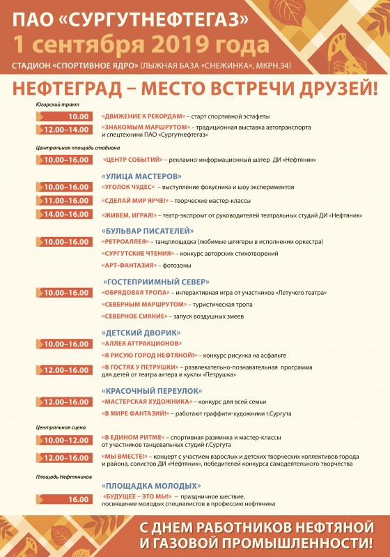 1 сентября главной праздничной площадкой города станет стадион «Спортивное ядро» на Югорском тракте. В программу, организованную нефтяниками «Нефтеград – место встречи друзей», включены разнообразные развлечения для совместного отдыха взрослых и детей. Ее откроют в 10 утра спортивная эстафета, разминка и мастер-классы от участников танцевальных студий города. В это же время на стадионе заработают сразу несколько площадок по интересам: «Улица мастеров», «Бульвар писателей», «Детский дворик», «Гостеприимный север», «Красочный переулок». Порадуют сургутян творческие коллективы города и района. Традиционно будет работать выставка автотранспорта и спецтехники ПАО «Сургутнефтегаз». Завершат тожество в 16:00 праздничное шествие молодых специалистов «Будущее – это мы!» и церемония посвящения в профессию, которая пройдет на площади Нефтяников.